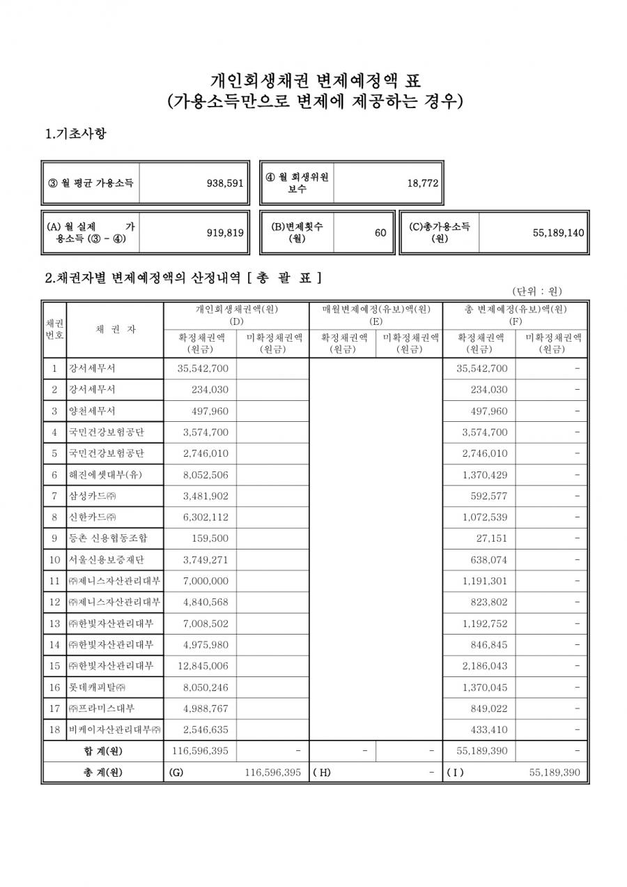 55세, 사업실패, 개인회생 개시결정, 원금 1억1600만원, 일반채권변제율 17%