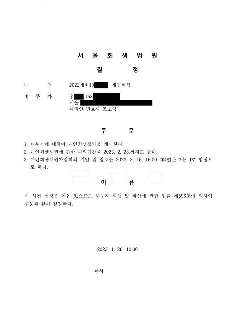 55세, 사업실패, 개인회생 개시결정, 원금 1억1600...